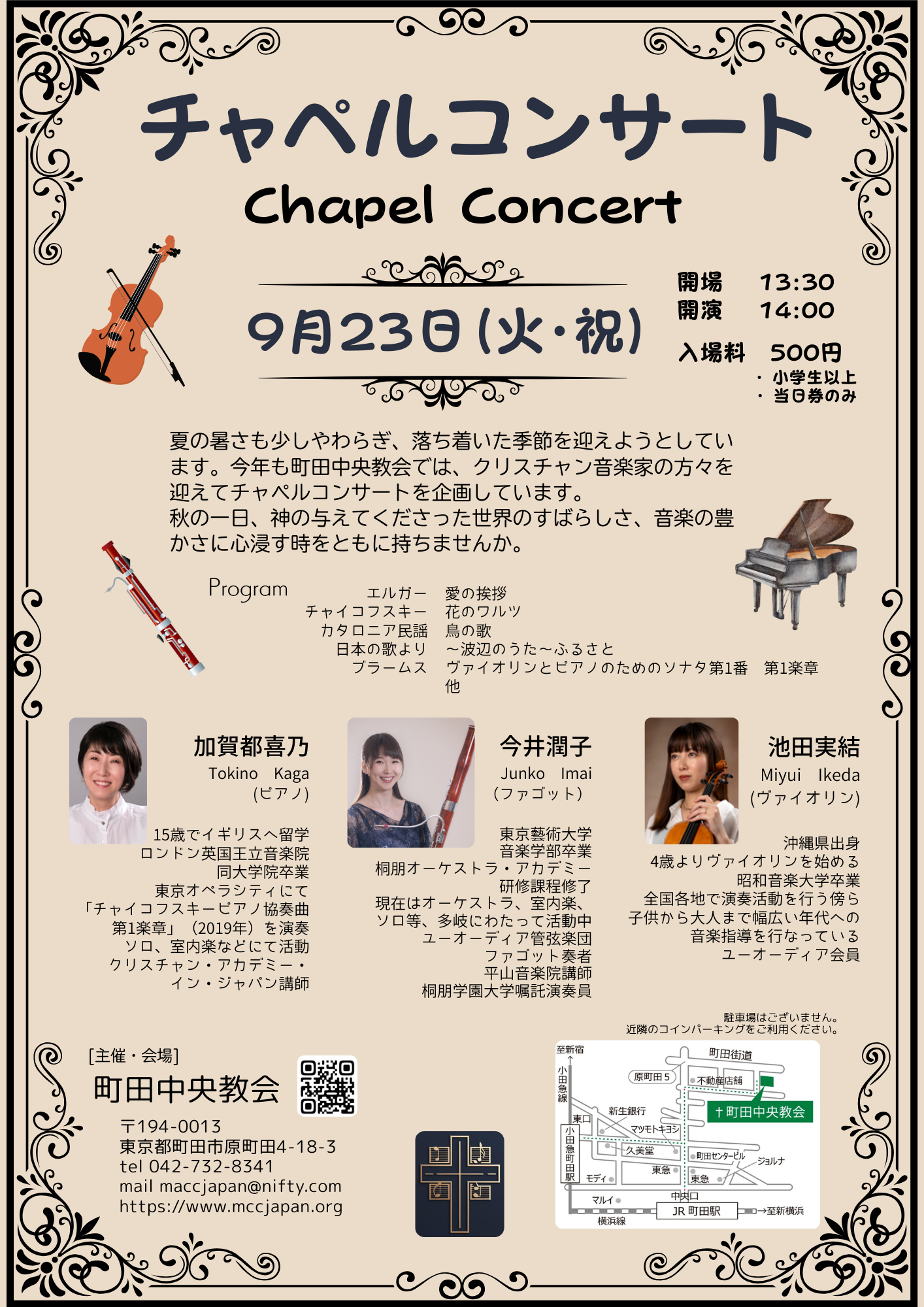 毎年好評のクラシックコンサートを、今年も教会堂で開催します!今年は、ピアノ、バイオリン、ファゴットの3重奏♪ ファゴットは少し珍しい楽器かもしれませんが、あのジブリ音楽で使われているとてもきれいな音色が魅力です。ぜひ、皆様お誘いあわせの上お越しください。全席自由・500円ワンコインでお楽しみいただけます☺詳しくはチラシをご覧ください。
